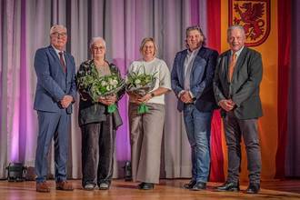 v.l.n.r. Noch-Bürgermeister Wolfgang Denzer, Ehefrau Kornelia Denzer, Ehefrau Petra Spitzer, der künftige Bürgermeister Peter Spitzer, Erster Beigeordneter Timo Bäuerle