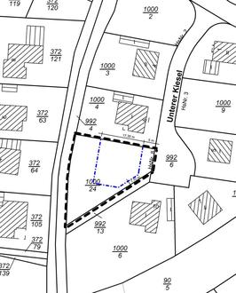 Gegenstand der Änderung ist die Erweiterung des festgesetzten Baufensters um 1,30 m nach Südosten zum öffentlichen Fußweg Flurstück Nr. 992/13 und um 2,30 m nach Westen zum öffentlichen Weg Flurstück Nr. 992/4.