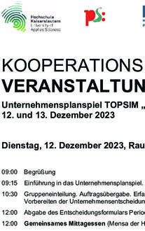 Vom 12. bis 13. Dezember 2023 findet an der Hochschule Kaiserslautern, Campus Zweibrücken, Raum A105 von jeweils 9 bis 16 Uhr das Unternehmensplanspiel TOPSIM unter dem Motto Management Essentials statt, in dem sich die Berufsbildenden Schulen Pirmasens und Rodalben einen Schlagabtausch um das bessere unternehmerische Geschick und Gespür liefern.