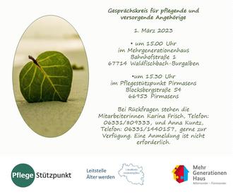 Beide Gesprächskreise finden am Mittwoch, 01.03.2023 statt. Um 15:00 Uhr im Mehrgenerationenhaus, Bahnhofstraße 1 in Waldfischbach- Burgalben und um 15:30 Uhr im Pflegestützpunkt Pirmasens, Blocksbergstraße 54.