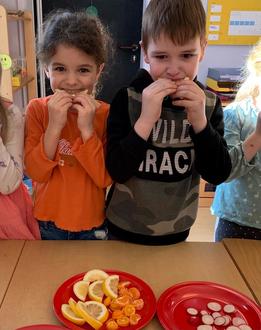 Neben Bewegungsliedern, Spielen und einer leckeren Kostprobe, lernten die Kinder viel über Obst und Gemüse, deren Geschmack und Aussehen kennen.