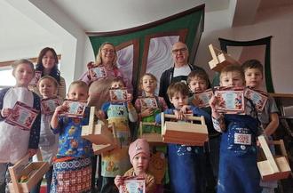 Nun kam der Höhepunkt: Wir stiegen die steile Treppe seiner Werkstatt hinauf in ein Atelier, wo viele Schätze zu entdecken waren, u.a. sogar schiefe Schränke. Hier überreichte Tischlermeister Wolfram Böhnhardt jedem Kind und natürlich auch uns Erzieherinnen einen richtigen Kindertischlergesellenbrief. Dazu gab es für jeden noch eine selbstgebaute Werkzeugkiste mit Werkzeugen und kleine Überraschungen, welche Wolframs Frau Anke ganz liebevoll für uns zusammengestellt hatte.