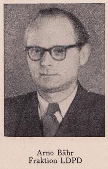 Der 1910 als Arno Schröter in Scherbda geborene Arno Bähr war von 1950 bis 1958 (bis zur Republikflucht seines ältesten Sohnes) für zwei Legislaturperioden Mitglied der Volkskammer der DDR. Das Foto stammt aus dem 1957 erschienenen „Handbuch der Volkskammer der Deutschen Demokratischen Republik“.
