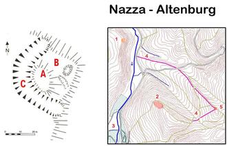 C= Wallgraben, A= Bürghügel, B= Plateau, Orientierungsplan zur Lage der Altenburg: 1- Altenburg, 2- Haineck, 3- Nazza