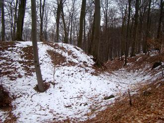 Blick über den Wallgraben zum Burghügel der Altenburg.