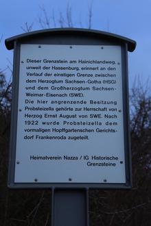 Oberhalb Nazzas, unweit der alten Landwehr und bei der „Hassenburg“, wurde von der IG Historische Grenzsteine aus Nazza ein Grenzstein saniert und diese Erinnerungstafel aufgestellt.