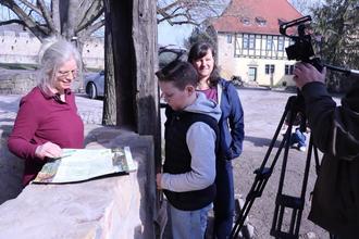 Bjarki und Julia auf der Creuzburg. Tourismusberaterin Susanne Werkmeister erklärt wie die Orte an der Werra zusammengehören.