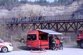Feuerwehrgroßaufgebot mit zwei Schlauchbooten und einer Drohne an der Ebenauer Brücke.