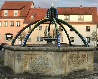 Osterhasenfamilie und Krone auf dem Osterbrunnen in Creuzburg. Vielen Dank an die fleißigen Osterbrunnenschmücker aus Creuzburg!