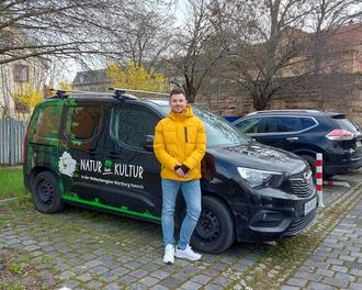 Regional-Tourismuskoordinator Robin Wawrzik mit dem neuen „Welterbe-Mobil“