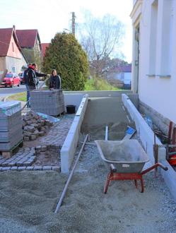 Hier entsteht gerade die behindertengerechte Zufahrt zum Gebäude. Die Räume in den vier Etagen sind weitgehend fertiggestellt. Toiletten, Heizungsanlage (Wärmepumpe kombiniert mit einer Photovoltaikanlage) und die Räume für den Multiraum und die Arztzimmer sind ebenso fertig wie die beiden Wohnungen in den oberen Etagen.