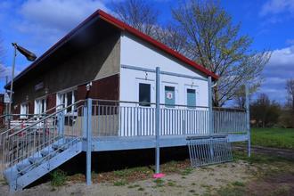 Blick auf die neue Toilettenanlage mit der verputzten Gebäudefront. Hier wird ein Terrassendach angebaut werden.