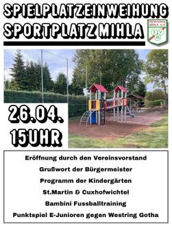 Der SV Mihla e.V. möchte alle Kinder und Eltern zur offiziellen Eröffnung des neuen Spielplatzes auf dem Mihlaer Sportplatz ganz herzlich einladen!