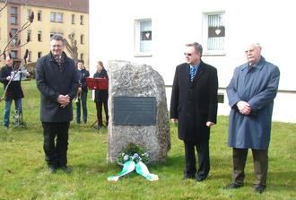 Roderich Böhm, der Sohn Heinrich Böhms (rechts), berichtete auch als Zeitzeuge über die Ereignisse in Mihla, hier bei einer Gedenkfeier am Gedenkstein für die hier gefallenen US-Soldaten an der Alten Post in Mihla