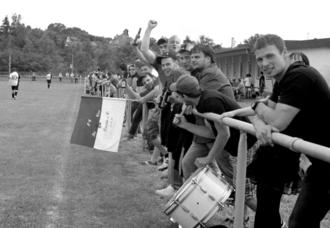 Fans des FC Rot-Weiß Scherbda während des Aufstiegsspiels in Berka/Werra am 14. Juni 2009. Rechts im Bild der Vize-Weltmeister im Viererbob Alexander Rödiger.
