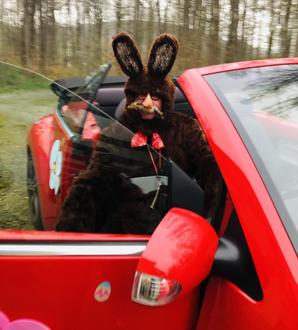 18.00 Uhr war es soweit. Simone Moenke hatte das offene Fahrzeug, ihren roten VW-Käfer, österlich geschmückt. Mit diesem Fahrzeug wurde der Osterhase persönlich zum Festplatz gebracht.