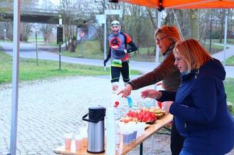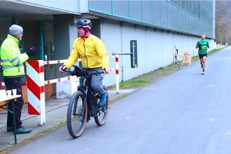 Der spätere Sieger im Marathon Daniel Claus von der BSG Chemie Leipzig erreicht die Versorgungsstelle in Buchenau. Mit dabei der Begleitfahrer für die Spitze. Er benötigte für die Gesamtstrecke 2. Stunden, 50 Minuten und 11 Sekunden.