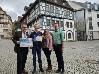 (v.l.) Christoph Gösel, Geschäftsführer der TTG, Dr. Jochen Birkenmeier, Leiter des Lutherhaus Eisenach, Anne-Katrin Ibarra Wong, Geschäftsstellenleiterin des Welterberegion Wartburg Hainich e.V., und Stefan Seelig, Touristische Infrastruktur der Stadt Eisenach, bei der Urkundenübergabe vor dem rezertifizierten Markenbotschafter Lutherhaus Eisenach