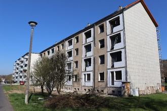 Rechts der gerade für die Sanierung entkernte Wohnblock, links jener Block, dessen Sanierung bereits abgeschlossen ist.