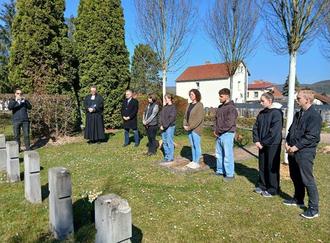 Auf dem Mihlaer Friedhof trafen sich Schüler der 9. Und 10. Klassen der Schule mit ihrer Geschichtslehrerin und einigen Bürgern mit Pfarrer Hoffmann und Bürgermeister Lämmerhirt.