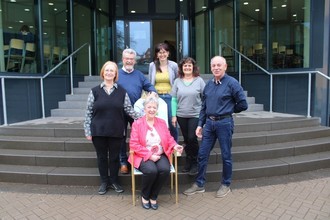 Im Kreis früherer und jetziger Direktoren: Martina Zenker, Lutz Berger, Schulleiterin Sindy Klose, Kollegin Christina Hoffmann und Uwe Schwanz (Fotos Oliver Rindschwentner).
