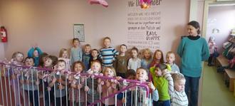 Der Mittwoch begann für alle Kinder und Erzieherinnen mit einem leckeren Osterbuffet. Mit dem Lied "Stubs der kleine Osterhase" wurde dieses zünftig eröffnet. Nach der kulinarischen Stärkung ließen die Kinder bei Sport und Spiel ihrem Bewegungsdrang in zahlreichen Stationen freien Lauf. Natürlich gab es auch kreative Angebote, bei denen die Kinder Hasen gestalten, Osterbilder tupfen oder Gipsfiguren formen konnten.