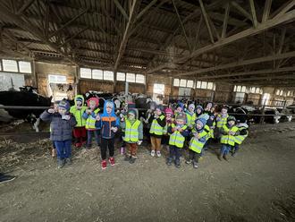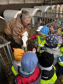 In Neukirchen angekommen, erwartete die kleinen Besucher ein beeindruckendes Spektakel. Staunend standen sie vor den riesigen Traktoren, die sonst nur aus der Ferne zu beobachten sind. Der Chef des Agrarbetriebs nahmen sich geduldig Zeit, die Funktionen der Geräte kindgerecht zu erklären und ließ die Augen der Kinder leuchten, als sie im Anschluss selbst mal im großen, grünen Fendt Trecker Platz nehmen durften. Doch nicht nur die Technik begeisterte die jungen Entdecker. Ein besonderes Highlight war der Besuch bei den Tieren. Die Kinder konnten Kühe und ihre niedlichen Kälbchen aus nächster Nähe betrachten. Auch die wolligen Schafe zogen die Aufmerksamkeit auf sich und ließen so manches Kinderherz höherschlagen. Neben den tierischen Bewohnern lernten die Kindergartenkinder auch einiges über den Anbau von Getreide, wie Weizen und Gerste. Anschaulich wurde ihnen erklärt, wie aus kleinen Körnern die Nahrungsmittel entstehen oder daraus Tierfutter gemacht wird. Der Melkroboter, welcher bei den Küken zu Einsatz kommt, zeigte den Kindern wie die Milch gemolken wird und dann im großen Trank auf das Milchauto zur Weiterverarbeitung wartet. Als Überraschung wartete für jedes Kind eine Schokomilch zur Verkostung, welches das Milchunternehmen zur Verfügung gestellt hatte.
