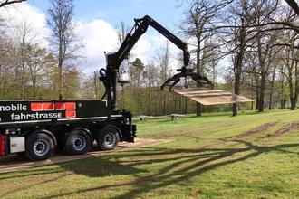Punktgenau wurde diese mobile Fahrstraße dann am Montag (24.4.) verlegt. So konnte der Tieflader mit der rutsche und der Kran dann am darauffolgenden Tag bis zum zukünftigen Standort der Rutsche fahren, ohne Probleme.