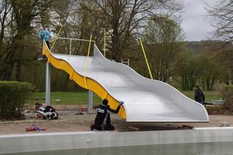 Dann ging es los. Zuerst wurden die hinteren Stützen aufgestellt, dann folgte die Treppe und schließlich das Hauptstück, die Rutsche selbst. Gegen Mittag war dies geschafft. Nun folgten noch die weiteren Stützen und das Geländer. Am frühen Nachmittag konnten dann die Rutschenbauer der Firma Wiegand ihr Werk abschließen.