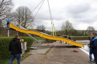 Noch einige Zentimeter, dann ist die Rutsche am richtigen Platz. Kranführer, Rutschenbauer und auch die Fundamentbauer lieferten ein Meisterstück ihrer Arbeit ab.