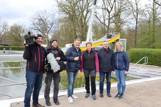 Der Einbau der Rutsche stand im Mittelpunkt des Medieninteresses. Moderator Christian Müller vom MDR (Mitte) mit seinem Aufnahmeteam zum abschließenden Gruppenfoto mit Heike Kasper und Isabel Endregat sowie Bürgermeister Rainer Lämmerhirt. Neben der Thüringer Allgemeinen und der Landeszeitung interviewte auch Andy Rückowald vom Mitteldeutschen Rundfunk.
