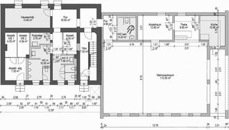 Grundriss des Untergeschosses mit dem Bestandsgebäude (links) und dem geplanten Anbau Zeichnungen: Dipl.-Ing. Arch. A. Leinhos