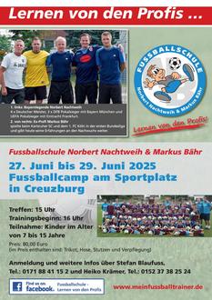 Auch in diesem Jahr wird die Fußballschule Nachtweih/Bähr wieder in Creuzburg zu Gast sein - nun schon zum zwölften Mal! Das Fußballcamp findet vom 27. bis 29.06.2025 auf dem Creuzburger Sportplatz statt.