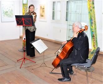Kristina Kato, Violine, und Eugen Mantu am Violoncello begleiteten musikalisch die Ausstellungseröffnung.