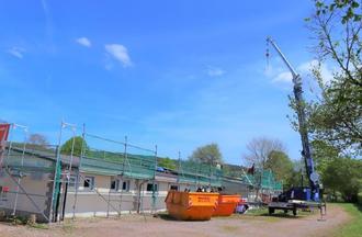 Derweilen arbeitet die vom Stadtrat beauftragte Fachfirma mit der entsprechenden Technik an der Wiederherstellung des Dachs des Sozialgebäudes. Hierbei geht es zügig voran.