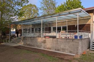 Nach der Erneuerung des Daches, dem Umbau der Toilettenanlage und der Neugestaltung der Terrasse konnte nun auch das Terrassendach eingebaut werden.