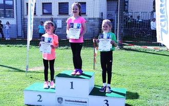 Siegerehrung bei den Kinderläufen, hier Henriette Liebetrau als Siegerin, Annalena Nickol auf Platz 2 und Nayla Sülner als Drittplatzierte.