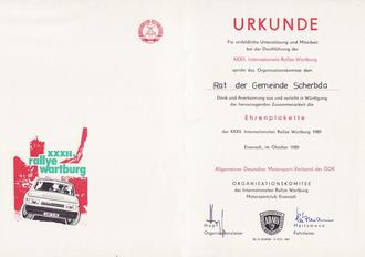 | - | Oktober 1989: Der Rat der Gemeinde Scherbda erhielt die Ehrenplakette der XXXLL. Internationalen Rallye Wartburg 1989 als Dank für die vorbildliche Unterstützung und Mitarbeit bei der Durchführung des Rennens. Eine Geschwindigkeitsprüfung führte von Lengröden über Hahnroda, Buchenau, Freitagszella und Scherbda nach Frankenroda[13]. |