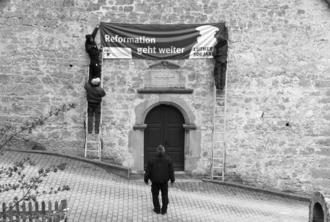 Vorbereitungen zum Reformationsjubiläum an der Scherbdaer Kirche.