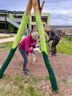 Denn viel war geschafft, als wir am Ende des Tages das Gelände mit einem zufriedenen Gefühl wieder verließen. Die alte Rutsche wurde entfernt und eine neue - gesponsert über Lottomittel durch das Thüringer Ministerium für Wirtschaft, Wissenschaft und Digitale Gesellschaft - eingebaut. Erdwälle wurden geebnet, Wege und Fallschutz gesäubert. Spielgeräte und Zäune wurden auf Sicherheit kontrolliert, restauriert und neu angestrichen.