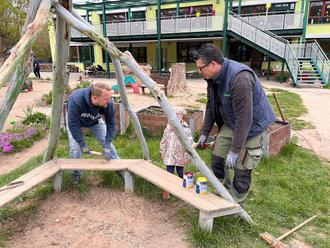 Ende April hatten wir das große Glück unsere ASB Hausmeister für eine Woche zu bekommen, die viele Vorarbeiten und Vorbereitungen treffen konnten. In diesem Zeitraum trafen sich an zwei Nachmittagen Kollegen/innen und Eltern, um gemeinsam tätig zu sein. Arbeitseinsatz in der Kita ist schon zu einer Tradition geworden, in dieser Konstellation, mit Kraft und Schweiß, Engagement und Freude, eine große Energieleistung zu mobilisieren.