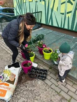 Mit den vielen gesponserten Hornveilchen von unserer Gärtnerei Möbius - Vielen Dank - erstrahlen die Blumenkästen und Rabatten in zarten Frühlingsfarben. Das Gelände scheint nun heller, gepflegt und farbenfroh. In den kommenden Wochen werden noch ein Spielhäuschen und eine Spielkombination für unsere Kleinsten dazu kommen.