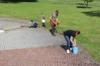 Gemeinsam bekämpften Alt und Jung das Unkraut am Planschbecken.