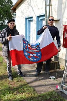 Mit dabei auch wie in jedem Jahr Altschwimmmeister Jürgen Heuer. Dieser ließ es sich nicht nehmen, zu Beginn der Arbeiten symbolisch mit weiteren Helfern, so seinem Sohn Benjamin, die Thüringenfahne über dem Bad zu hissen. Das ist traditionell das Zeichen, dass die neue Saison nun bald losgeht!