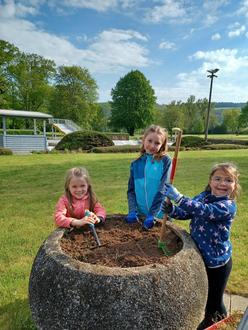 Die jüngsten Helfer beim Bepflanzen der Blumenkübel. Ein Dank hier wieder an Gärtnermeister Michael Möbius, der diese Aktion seit langer Zeit unterstützt.