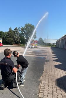 Als das Kommando zurückkehrte, durften wir selbst Hand anlegen: Wasserspritzen, Knoten binden und ein Gruppenfot vor der Drehleiter machen. Die Zeit verging wie im Flug und wir sind sehr dankbar für diese Gelegenheit.
