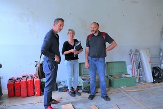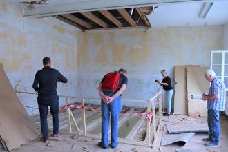Besichtigung der Deckendurchbrüche für den zukünftigen Fahrstuhl.