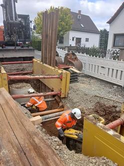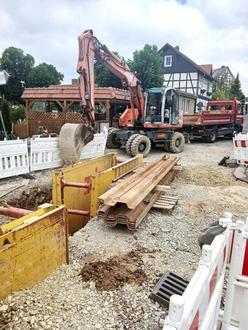 Nachdem der Kanal über Privatgrundstücke von der Schornstraße bis zur Friedhofgasse verlegt wurde wird nun am Straßenkreuz mit der Schornstraße gearbeitet.