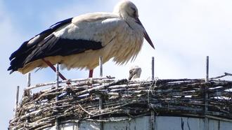 Mindestens zwei Storchenjunge wurden im Nest entdeckt. Beinahe zeitgleich schlüpften im Schwanennest zu Füßen der Störche auch mehrere Küken, wahrscheinlich vier.