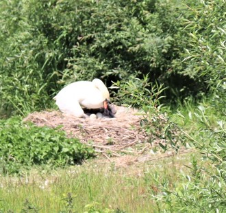 Mindestens vier Küken werden von der Schwanenmutter umsorgt.